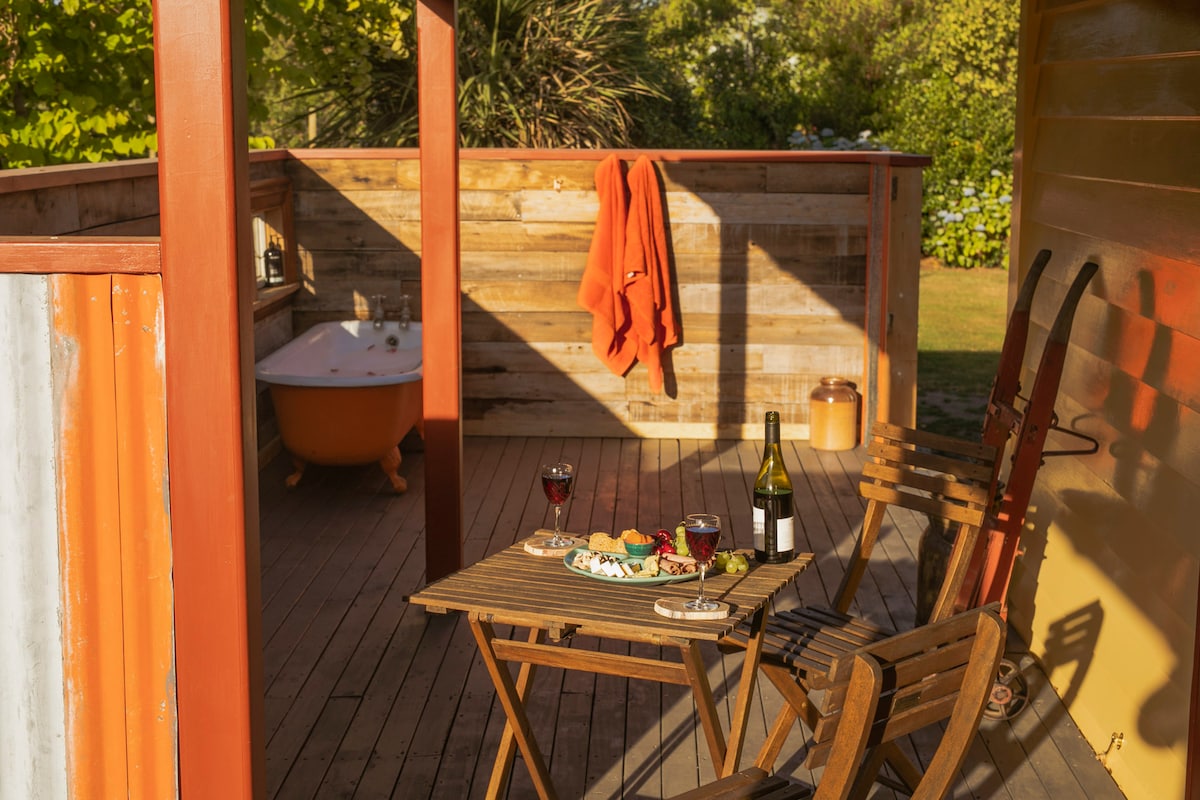 Quirky cottage completely renovated using as many recycled materials as possible with some special touches. Recycled materials were used from The Art Deco Mayfair threatre in Kaikoura. Also materials used from The Adelphi Hotel built in 1918. Kitchen custom made out of recycled cross arms off power polls and various other native timbers. Modern conveniences with stacks of retro and rustic charm. Enjoy a hot outdoor bath with a view to the mountains and two minutes walk to the beach.