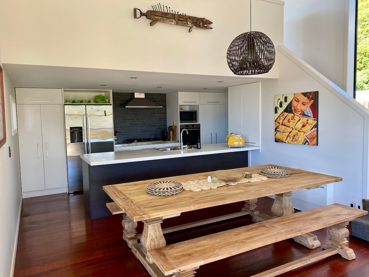 'The Kaikoura' Treat yourself to a luxury escape in our sunny, spacious & relaxing bach with gorgeous ever changing mountain & sea views. Architecturally designed over three levels, with wonderful indoor outdoor flow, dine or BBQ on one of the two decks or stroll into town for restaurants/cafes & bars. Situated on the sheltered Northern side of the peninsula & just a stones throw from the beach its one of the best spots in town.