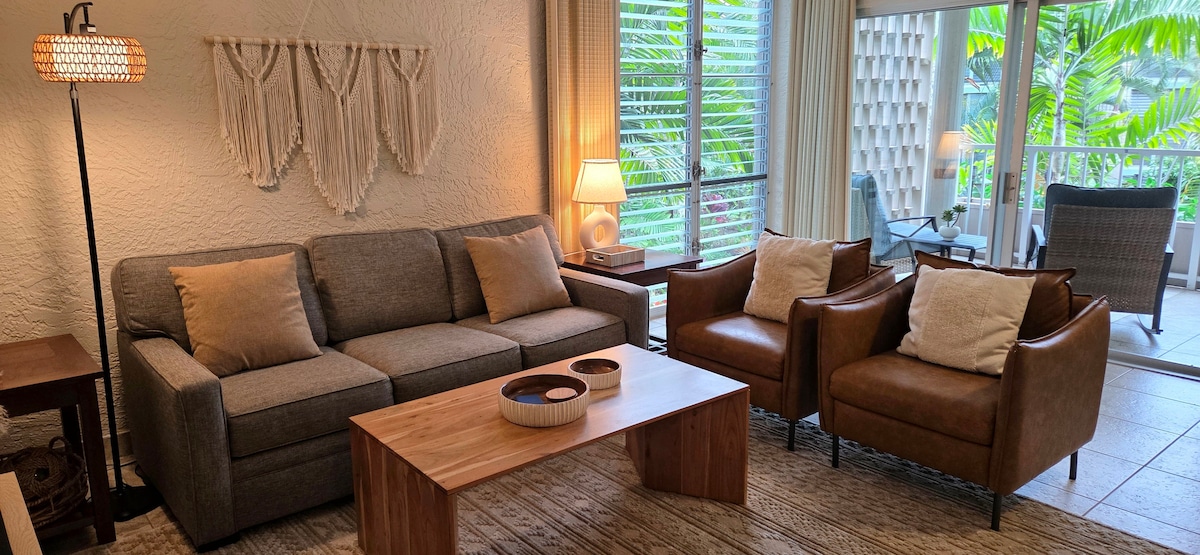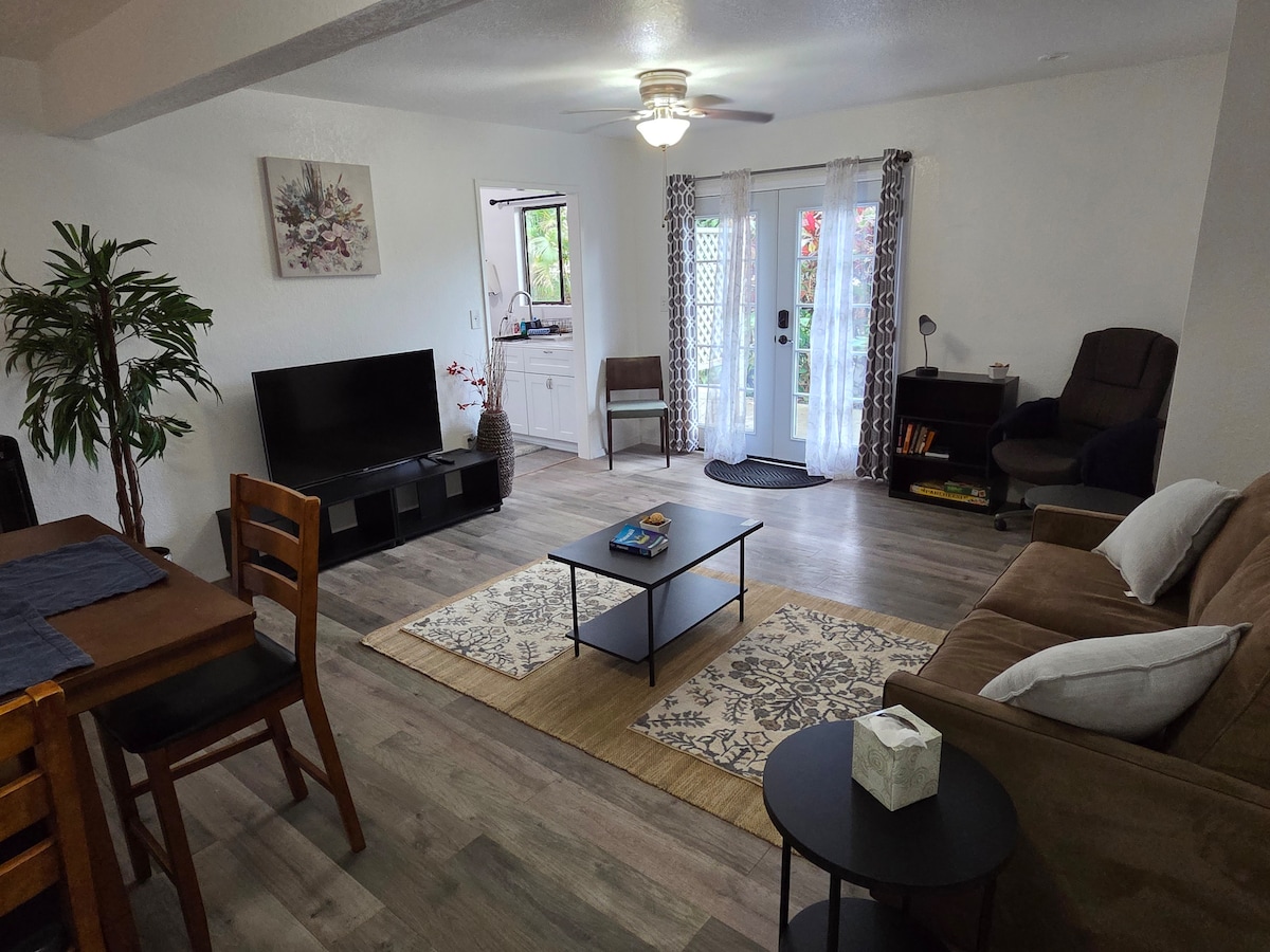 Designed by Twin Islands Interior Design Group - Escape to Big Island and indulge in the tropical paradise of Hawaii with this charming 1 bedroom, 1 bathroom Airbnb property. Enjoy an ocean view from your breezy porch and sleep peacefully in a comfortable queen-size bed. AC unit in apartment, evenings and mornings are cool due to elevation. Spend lazy afternoons on the porch and soak up the jungle energy. Experience the magic of Big Island Kealakekua for yourself!