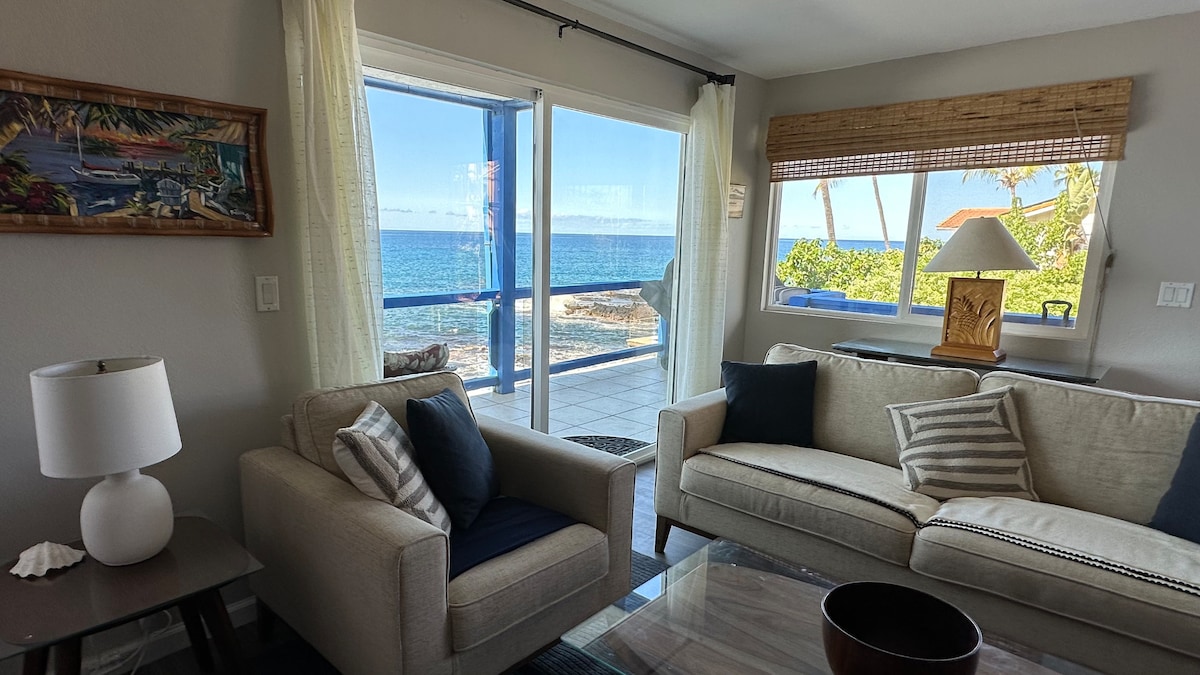 Newly renovated 2 bedroom, 2 bath ocean/beachfront condo w/ queen futon couch.Short walk to Kona town bars & restaurants. Snorkel, swim or surf right in front of condo. Enjoy the parade of activities in the ocean and on shore from the comfort of lanai couch. Watch dolphins spin, the whales breach, the outrigger canoe, adventurers parasailing, Ironman atheletes training and turtles feeding in tidepools. Enjoy stunning and unique nightly sunsets while dining on our live edge epoxy dining table.