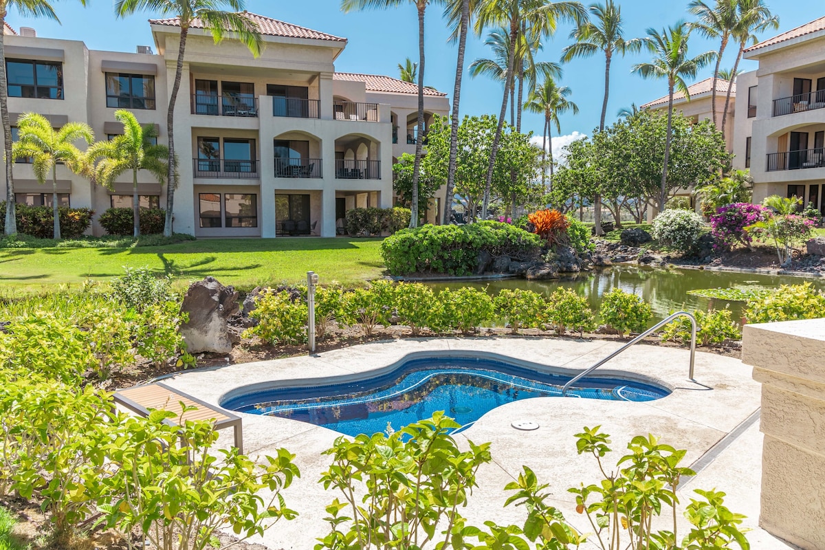 Enjoy your stay at this serene ground floor, remodeled in 2023, 1 bedroom 1 bath corner unit condominium in one of the best location of Waikoloa Beach Resort. * Lush tropical landscaping with ponds and waterfalls * Next to pool, tennis court, BBQ and fitness center * Walk to beach, shops, restaurants, entertainments and Grand Hilton * Free fast WiFi. Central A/C. Washer and dryer. * Spectrum Cable and Roku streaming TVs * Private Parking spot 50 yards from the front door