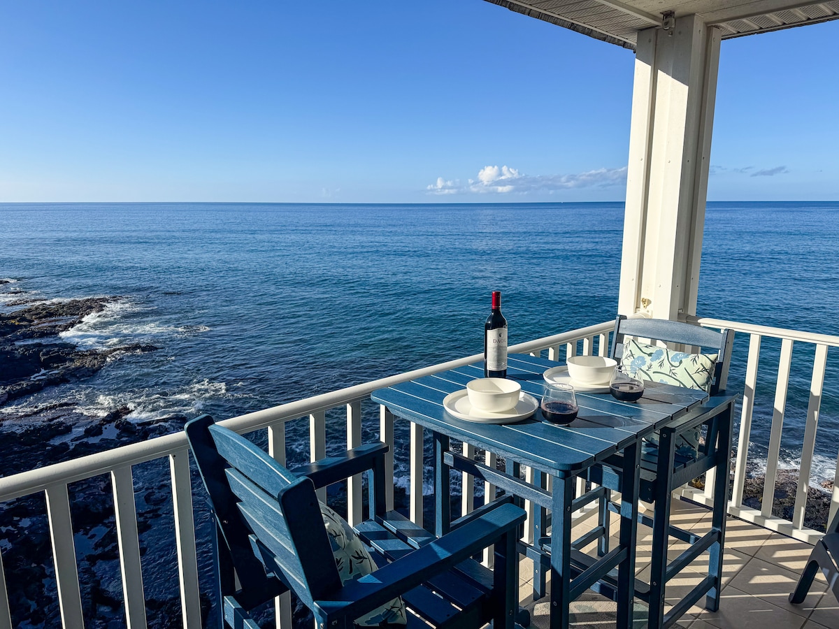 Serenity in Kona- with epic ocean views! Wake up with the ocean waves crashing below. Hang out on the lanai with some Kona coffee from the Green Flash cafe next door. You have a front row seat for whale watching during whale season. Or, hang out and enjoy the sunsets- at times with our local manta ray! We have a queen sofa bed, and AC. Close to town- an 18 minute walk. Quiet, very little road noise here. You can rent bikes too across the street.