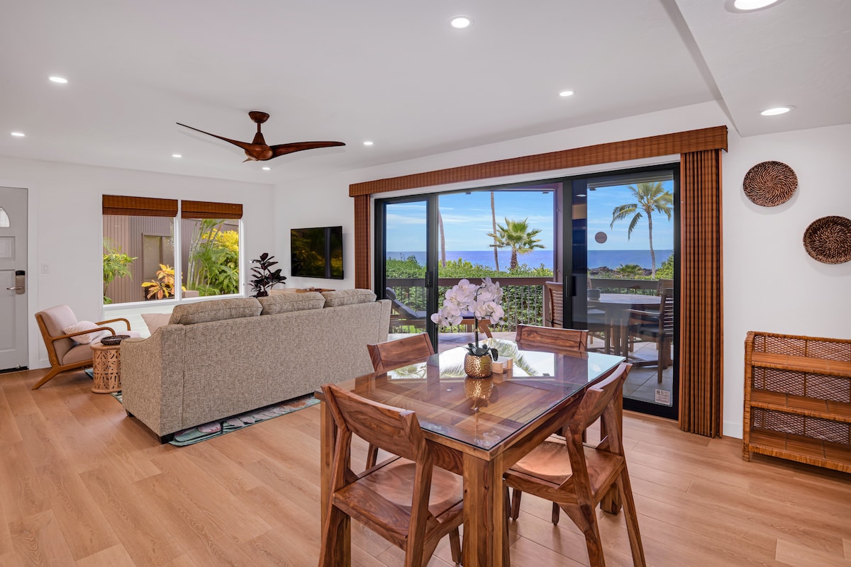 Best unit at Kailua-Kona’s popular Sea Village and one of the only with A/C! Captivating ocean views, breezes, tropical sights and sounds greet you in this easily accessible ground floor unit. Start your day on the private lanai watching the spinner dolphins and end it with a glass of wine watching sunset over the ocean. This fully updated, turn-key condo boasts open concept living and is 5 minutes to downtown. An ideal base for an individual, couple or small families to explore the Big Island!
