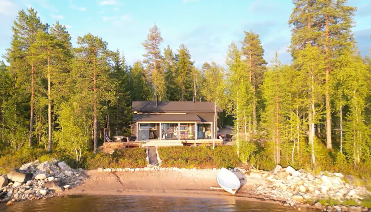 Escape to this cosy 'modern meets traditional' sauna cabin, hidden deep in the forest with breathtaking views over Lake Kiantajärvi. Facing southwest, enjoy stunning sunsets and pure tranquility. Relax in the wood-fired sauna & Hot tub, cool off in the lake. Perfect for a peaceful retreat, romantic getaway, or (semi) off-grid adventure. Unwind, reconnect, & enjoy the serene luxury cabin. Hot tub available for an additional fee, subject to availability and conditions.