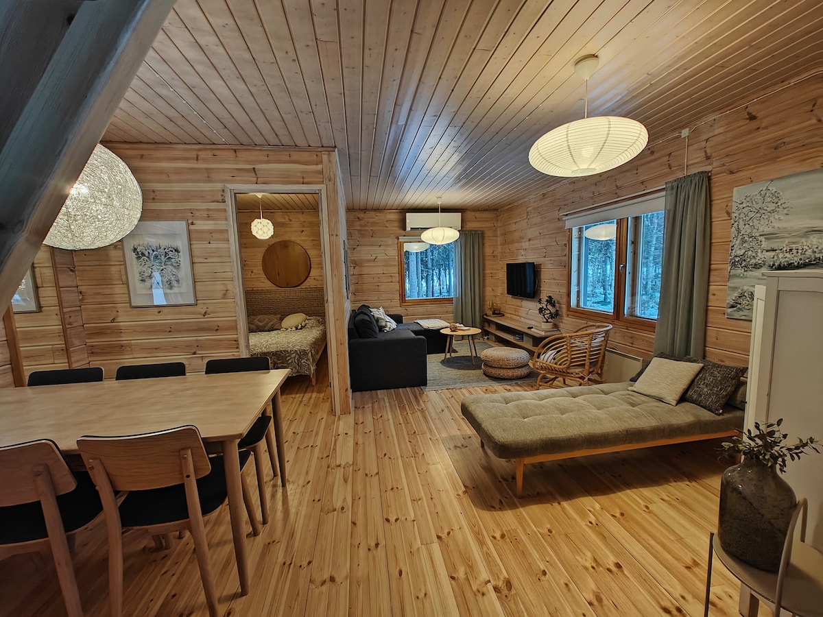 Escape to this cosy 'modern meets traditional' sauna cabin, hidden deep in the forest with breathtaking views over Lake Kiantajärvi. Facing southwest, enjoy stunning sunsets and pure tranquility. Relax in the wood-fired sauna & Hot tub, cool off in the lake. Perfect for a peaceful retreat, romantic getaway, or (semi) off-grid adventure. Unwind, reconnect, & enjoy the serene luxury cabin. Hot tub available for an additional fee, subject to availability and conditions.