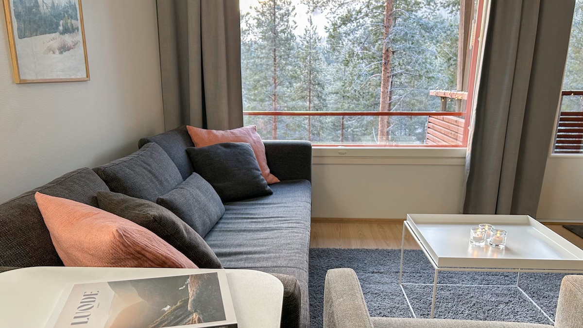 Bright, spacious, and pet-free fully equipped holiday apartment in the heart of Vuokatti, set in a peaceful pine forest with direct views of Vuokatti Hill. Close to ski slopes and cross-country tracks. A guest favorite, suitable for remote work and car-free travel. Cleaning included for bookings made after 18 Jan 2026. Two quiet bedrooms with blackout curtains. Excellent storage space. The nearest grocery store, restaurant, and EV charging station just a few hundred meters away.