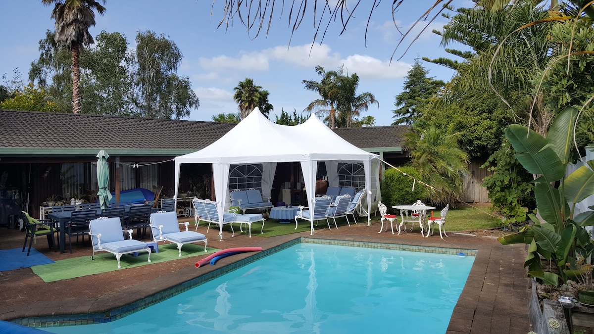 We are nine kms from Dargaville heading down the Pouto Peninsular just before the historic town of Te Kopuru. Situated on 2 acres of gardens with a large pond and an massive Norfolk pine. The entertainment area is sheltered from wind with a pool and spa pool to enjoy. If you are looking for a private location with amazing views and bird life give us a try.