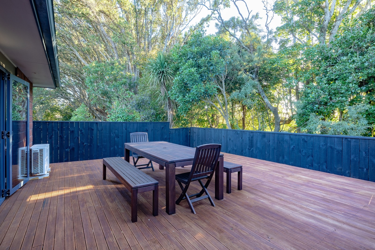 Nestled a leisurely 2-minute stroll away from the Beach and Coastal Walkway, and a 32 min drive to the Mountain, lies an elegantly designed self-contained studio, complete with a covered outdoor space and electric BBQ Grill. Across the road from the studio is the Coastal Walkway, a 13.2km trail that boasts breathtaking views of the sea. 32 min drive to Taranaki / Egmont National Park Visitor Centre. Driving: 5 min airport, 10 min city centre, 2 min public 24/7 laundromat and local shops.