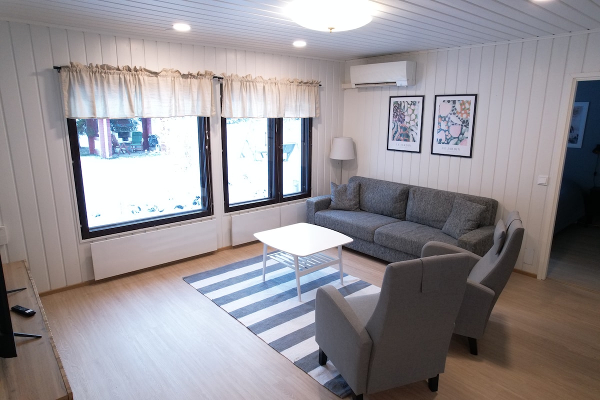 Hyvällä sijainnilla oleva saunallinen kaksio. Valaistut hiihtoladut ja ulkoilureitit ovat lähellä. Urheiluvaatteet voit pestä koneessa ja kuivata kuivauskaapissa. Lenkin jälkeen voit rentoutua saunassa. Autollesi löytyy katos, jossa on lämmityspistoke. Sähkö - ja hybridiauton lataus ei ole tässä mahdollinen. Lähin latauspiste löytyy läheisen S-marketin pihasta Asunnon loppusiivous kuuluu vuokralaiselle. Otathan omat liinavaatteet ja pyyhkeet mukaan.