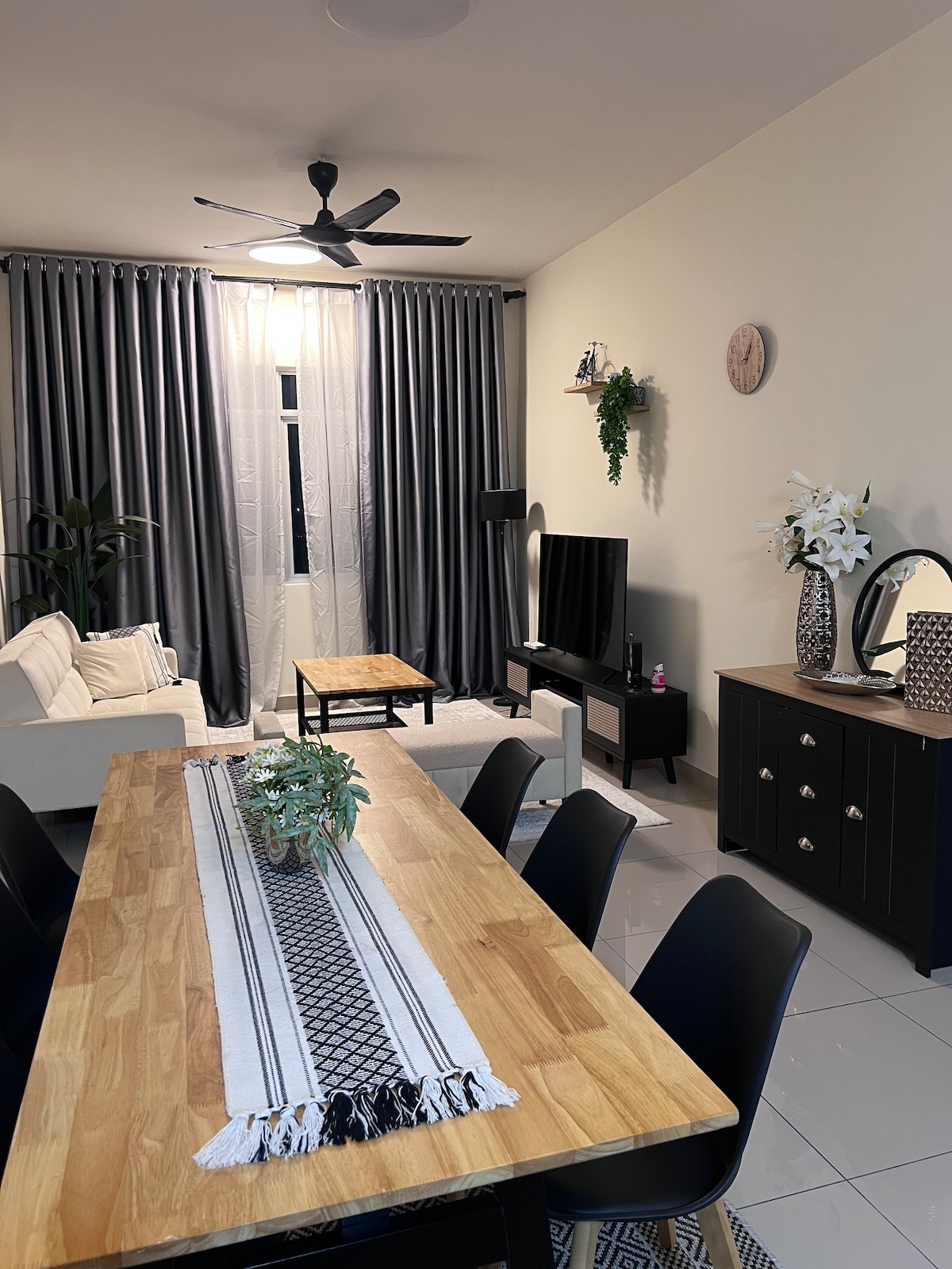 Our unit is suitable for family & friends and working people. Wifi & Free Parking provided. Aircond in Living room, Master bedroom and Medium Room. Fan in 3rd bedroom. Shopping Mall below the condo. McDonalds, Burger King, Korean CU Store, 7-11, Western & Local Restaurants, Watsons, ATM ,Cinema are available. Aeon Mall and The Mines Shopping are nearby around 5km. 时尚和现代化公寓,适合家庭,朋友聚会,工作人士。 我们提供 网络以及免费停车位。 客厅,主卧及二房有冷气,三房有风扇。 公寓楼下的商场有 快餐店,便利店,餐厅,提款机, 电影院。 公寓附近还有 Aeon Mall 和 The Mines