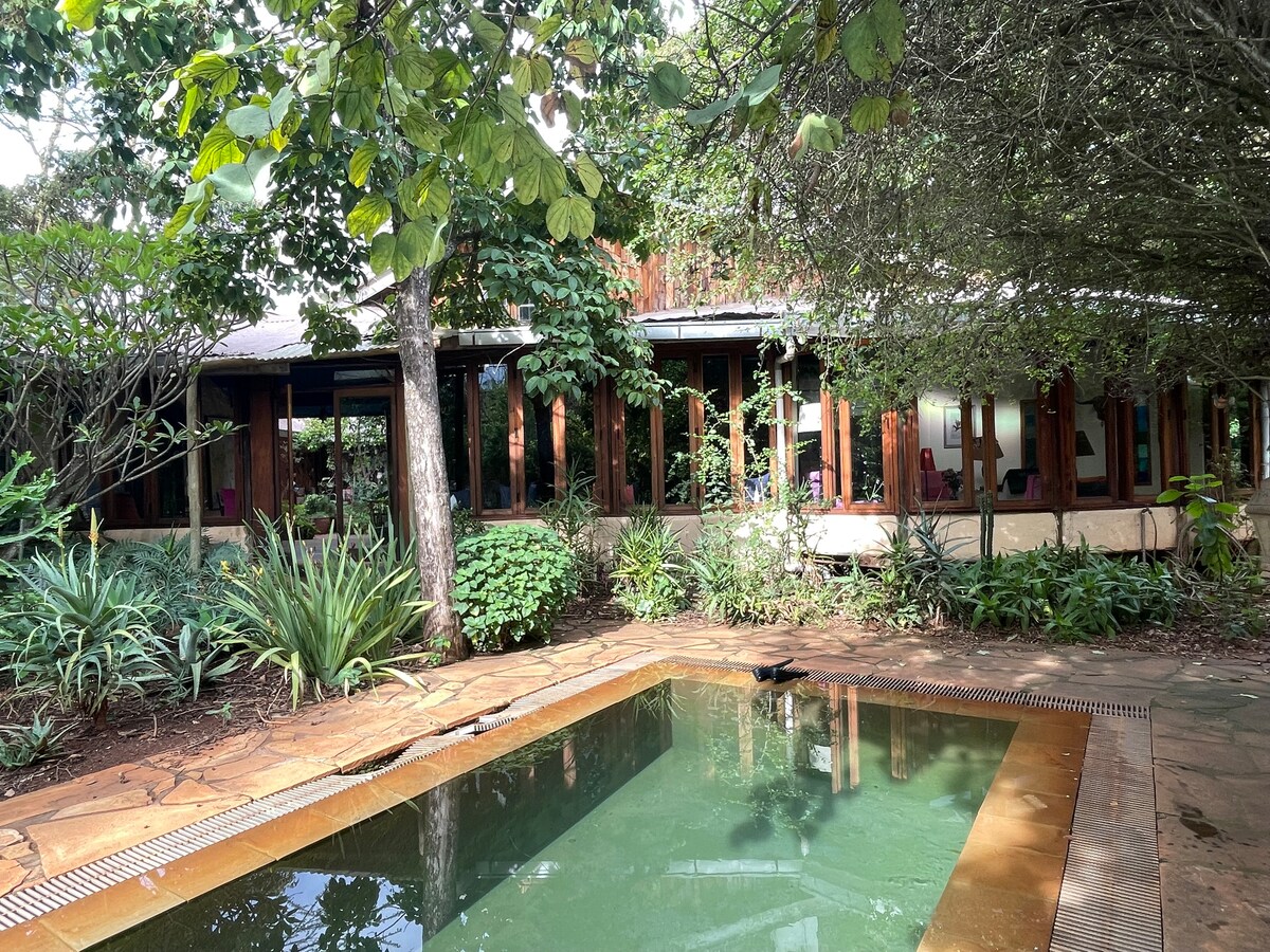 Idyllic bedsit, en-suite bathroom built around an indigenous African Bushwillow tree (Combretum Molle). Complete with chattering hoopoes, killer fire for Nairobi nights, wifi, electric fence, backup inverter & generator, two verandas, drinkable borehole water, mature garden & trees. 5min walk from the Kitengela Glass studio, the iconic Kenyan recycled glassblowers famed for their vibrant chunky artistic glass pieces. On the outskirts of Nairobi, 50min from Karen & 70min from Nairobi center.