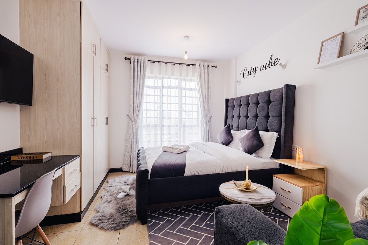 An elegant sanctuary designed for discerning travelers seeking comfort & style. This tastefully furnished one-bed apartment boasts contemporary décor with high-end finishes, creating a modern yet warm ambiance. The stunning architecture of the building not only enhances its aesthetic appeal but also reflects the vibrant spirit of Nairobi. Our fully equipped kitchen is perfectly crafted to elevate your stay. The apartment has the best sunset views in the evening & as well a view of the park!