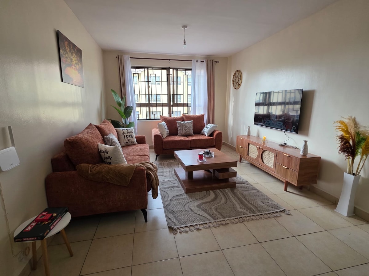 This unique place 9min to airport, has a style of its own. calm environment. Very clean. well furnished and modern fitting that are appealing, comfortable and would accommodate both a family and individual. Close proximity to the airport. SGR and malls. Host Has WIFI, Netflix and cleaning service, hence perfect to host for working individuals Relax with the whole family at this peaceful place to stay. comfortable orthopedic mattress/fresh clean & linens. The apartment building has 24/7 security.