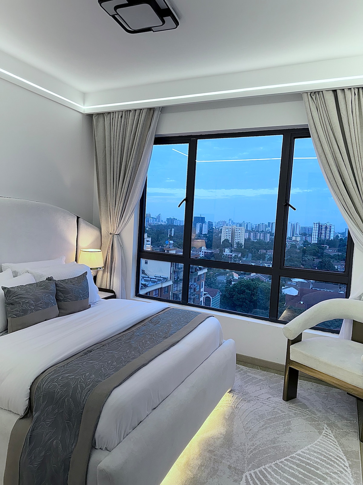 Welcome to SkyNest, perched on the 15th floor in the heart of Westlands, Nairobi. This stylish apartment offers modern luxury and breathtaking panoramic skyline city views. Discover Nairobi at its best with malls, shops, conference centers, and vibrant nightlife just a stroll away. After a day of adventures, return to your urban haven with state-of-the-art amenities. Unwind on your private balcony and soak in the city lights. SkyNest is your experience – where luxury meets location!