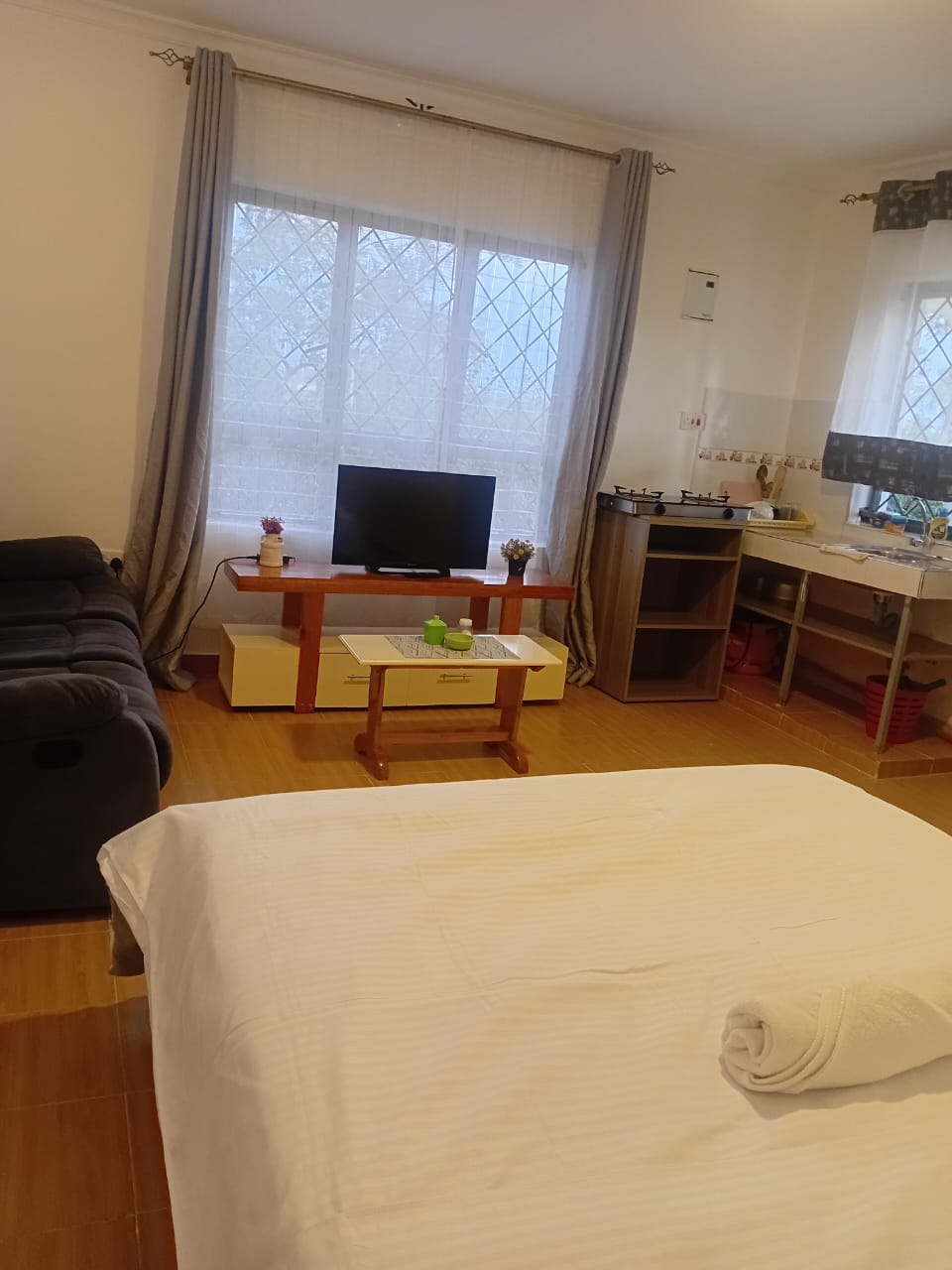 This warm and inviting studio is designed for comfort and relaxation, featuring soft warm lighting that creates a cozy, calming mood. The open-plan layout flows seamlessly onto a private balcony with beautiful green views, offering privacy and a peaceful connection to nature. Thoughtfully furnished and well maintained, this unit is ideal for business travelers, NGO staff, consultants, and professionals looking for a quiet, dependable space for work trips or extended stays in Bungoma.