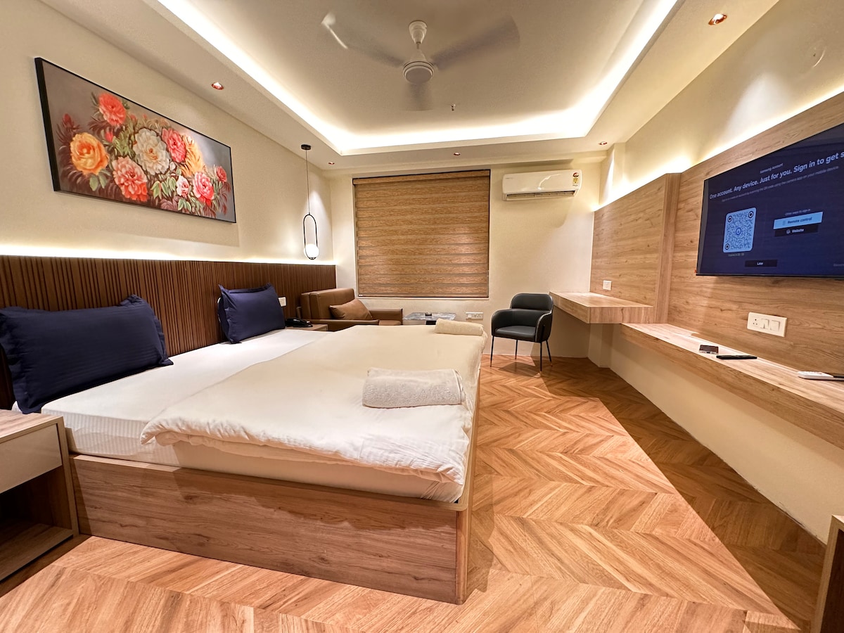 Kick back & relax in this calm & luxurious studio with the warmth of home & the vibe of a high-end hotel. Furnished with a plush King-size bed & modern décor. Amenities: 24/7 Grocery Store Modern Kitchenette High-Speed WiFi & TV Secure Parking outside tower but 24/7 Secured The first 2 floors has commercial shops, offering: Laundry Services Salon Café Medical Store Easy access to the India Expo Mart, Buddh International Circuit. Perfect for couples, solo travellers, or business partners.