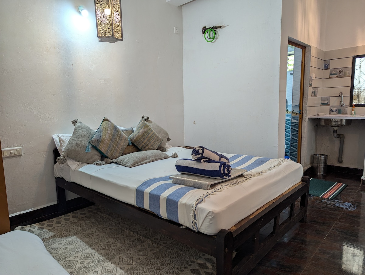 The first residence built on the property, this is arguably the most exquisite in artistic design and comforting by structure. The house is made of stone and is designed to be the perfect spot for solace along with dedicated privacy. We provide a private gate, front yard, a porch with a breakfast table, hammock & daybed, a kitchenette, and a spacious bathroom . The only room that comes equipped with its own geyser and fridge, this is the most special of our listings.