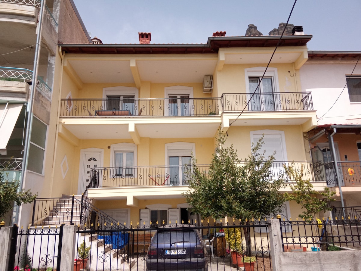 Spacious apartment with private beautiful garden, amazing view to Meteora rocks, great privacy, welcoming interiors. Perfect choice for families, couples, business travelers or groups of friends. It offers a true heaven of peace, ensuring privacy and relaxation. A glass of wine outside in our patio can be quite an experience! We would be glad to offer you a great experience and a taste of our hospitality.