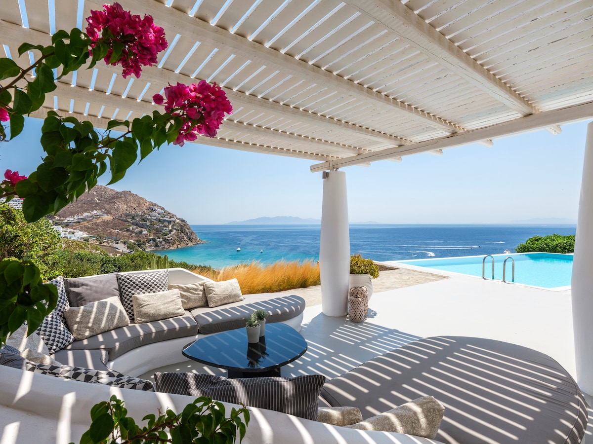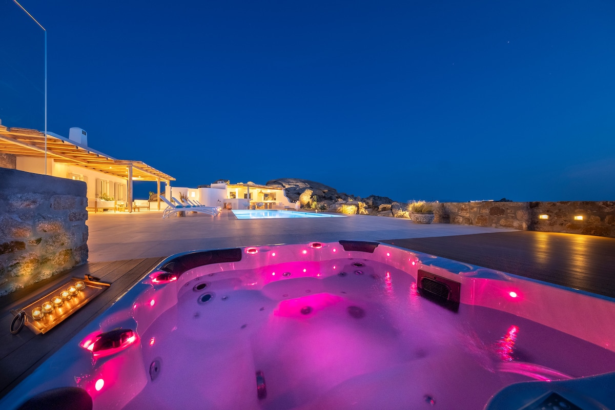 Take in panoramic, sunset views at this coastal villa, set in a calm sector to the north of Mykonos town. The terrace’s infinity pool melts into the sea beyond, as sunlight reflects off the recliners, hammam-style seating, and warm stone surfaces. Inside, a classic wooden roof meets white walls, fine furnishings, and alcove-laden bedrooms, with beaches, friendly tavernas, and day ferries close by. Begin the day in the ultra-modern kitchen of this ideally-placed home, with a freshly-made iced Greek coffee alongside still-warm pastries from the nearby bakery. Ease into the morning with a dip into the shimmering pool, relaxing hot tub soak and hammam session before catching up with some reading on the alfresco seating area. Freshen up amongst the carved stone basins of the comfortable bathrooms, before leisurely planning an outing. The lengthy, plush sectionals of the home’s living room are the ideal place for guests to swap stories, catch up and socialize in comfort, while bedroom balconies ensure guests can take in dusky evenings in total privacy and contemplation. The laneways near Lion Villa offer an impressive range of restaurants and tavernas, offering tangy seafood, fine Greek wines and crisp island-brewed beer. Make a visit to the island’s iconic windmills, or take in the fine vista from the nearby Armenistis Lighthouse. A range of sunny beaches are within a short drive, while the unique streets of Mykonos town are similarly close by, as is the ferry port, which offers stimulating day passages to other islands around the Cyclades. Copyright © Luxury Retreats. All rights reserved. BEDROOM & BATHROOM • Bedroom 1 - Primary: Queen size bed, Ensuite bathroom with stand-alone rain shower, Dual vanity, Air conditioning, Television, Private balcony, Sea view • Bedroom 2: Double size bed, Ensuite bathroom with stand-alone rain shower, Air conditioning, Television, Direct access to terrace, Sea view • Bedroom 3: Double size bed, Ensuite bathroom with stand-alone rain shower, Air conditioning, Television, Direct access to terrace, Sea view • Bedroom 4: Queen size bed, Ensuite bathroom with stand-alone rain shower, Air conditioning, Television, Private balcony, Sea view • Bedroom 5: Double size bed, Ensuite bathroom with stand-alone rain shower, Air conditioning, Television, Direct access to terrace, Sea view FEATURES & AMENITIES • More under “What this place offers” below Included: • More under “What this place offers” below Extra Cost (advance notice may be required): • Activities & excursions • More under “Add-on services” below