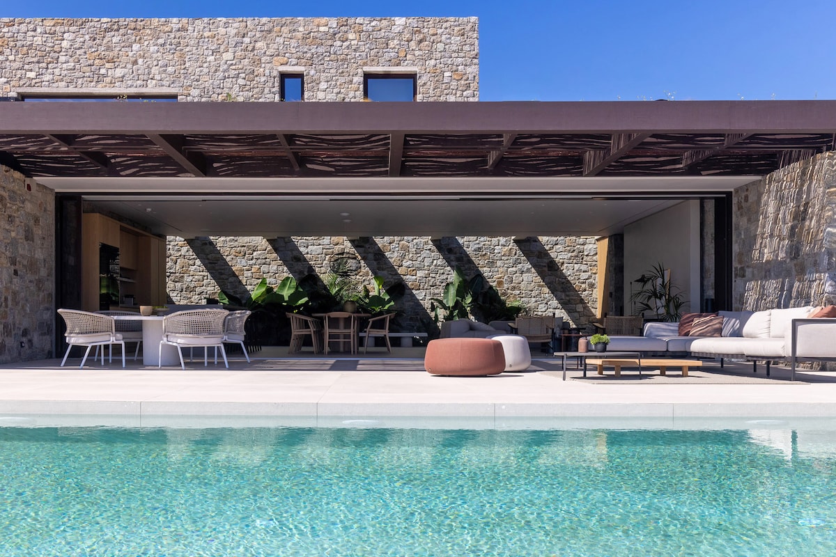 Designed by the Spanish architect Javier Barba, the villa balances ancient Cycladic principles with contemporary artistry (such as the beautifully wrought entry gate by Alekos Fasianos). Multiple outdoor living and dining areas include a pergola-shaded terrace with lounge, bar, and dining table. Down below, the ample pool terrace yields to a bistro-style observation deck. The vistas encompass the islands of Delos and Paros, as well as an antique church nearby.