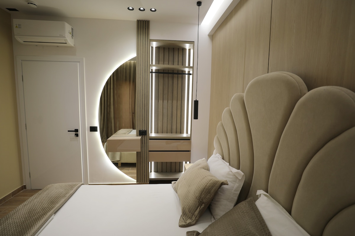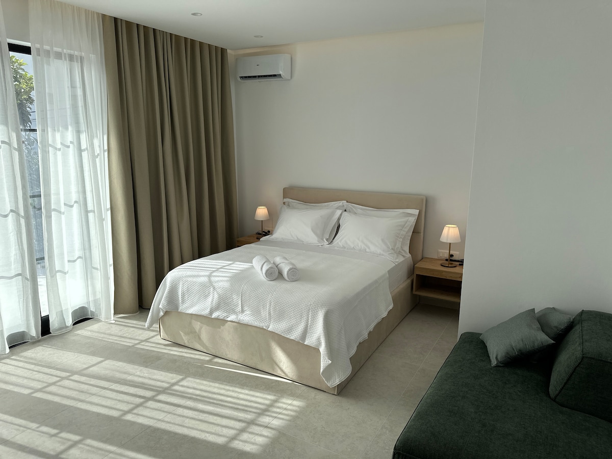This calm, stylish space overlooking the Ionian sea and the island of Corfu is just 300m from the Santa Quaranta Beach and has a nice little pool.The city center is 1 km away and fantastic beaches like Pulebardha and Pasqyra beach are no further than 10 km away.The neighbourhood is plenty of nice coffe bars and well known restaurants.