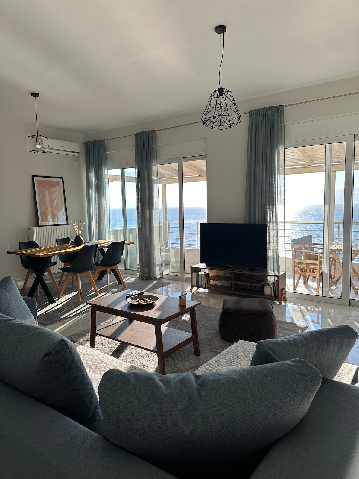Beachfront stylish penthouse with a spacious rooftop veranda and panoramic views of the Messinian Bay and the city, located in the heart of the seaside promenade. Bright, airy, and elegant, this cozy retreat is perfect for couples, friends, solo travelers, or business guests. Enjoy breathtaking sunsets, relax in the sitting and dining area, explore local bars and restaurants just steps away, and refresh at the sandy beach. Free Wifi & parking on the street!