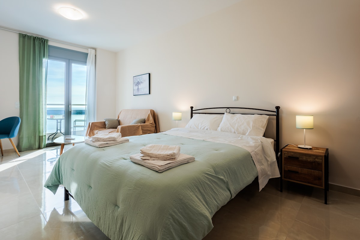 Στούντιο με θέα τον Μεσσηνιακό κόλπο και τους πρόποδες του Ταΰγετου. Κατάλληλο για καλοκαιρινές διακοπές αφού βρίσκεται στην παραλία Καλαμάτας! Με τη θάλασσα ακριβώς δίπλα και πολλές επιλογές για φαγητό, καφέ και ποτό. Το κέντρο της πόλης βρίσκεται σε κοντινή απόσταση (στάση λεωφορείου ακριβώς έξω από το σπίτι). Ιδανικό για ζευγάρια και μοναχικούς επισκέπτες. Παρέχονται δωρεάν δυο ποδήλατα για βόλτες στον ποδηλατόδρομο της πόλης.