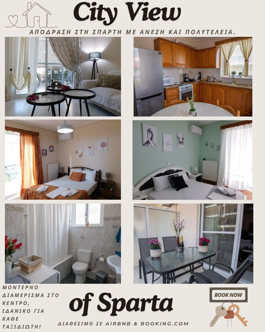 Ηλιόλουστο διαμέρισμα φωτεινό, ευρύχωρο και καλαίσθητο μόλις δύο λεπτά με τα πόδια από το κέντρο της Σπάρτης! Το διαμέρισμα είναι 94 τ.μ. Διαθέτει δύο υπνοδωμάτια με διπλά κρεβάτια και μεγάλες ντουλάπες. Και τα δύο υπνοδωμάτια διαθέτουν air condition και έχουν πρόσβαση σε ευρύχωρο γωνιακό μπαλκόνι. Το σαλόνι περιλαμβάνει έναν καναπέ γωνιακό πού γίνεται κρεβάτι και τραπεζαρία με έξι καρέκλες. Ολόκληρο το διαμέρισμα περικλείεται από άνετη γωνιακή βεράντα με θέα την πόλη της Σπάρτης!!