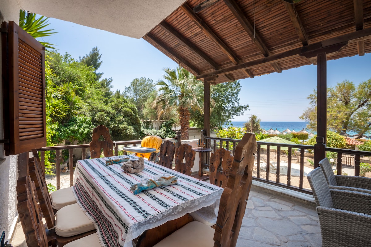 Traditional villa 5 meters from the best beach all over Chalkidiki which is characterized by esmerald crystal waters!!! Breathtaking view from the balcony. Kalogria is a sandy beach, located 7km from the pisturesque village of Nikiti, on the way to Neos Marmaras. This paradise villa is located in a family plot (shared by 2 other houses) with a beautiful garden, full of colourfull flowers and olive trees. A barbeque place is also situated at the patio. Near to the famous beach bar Mango!