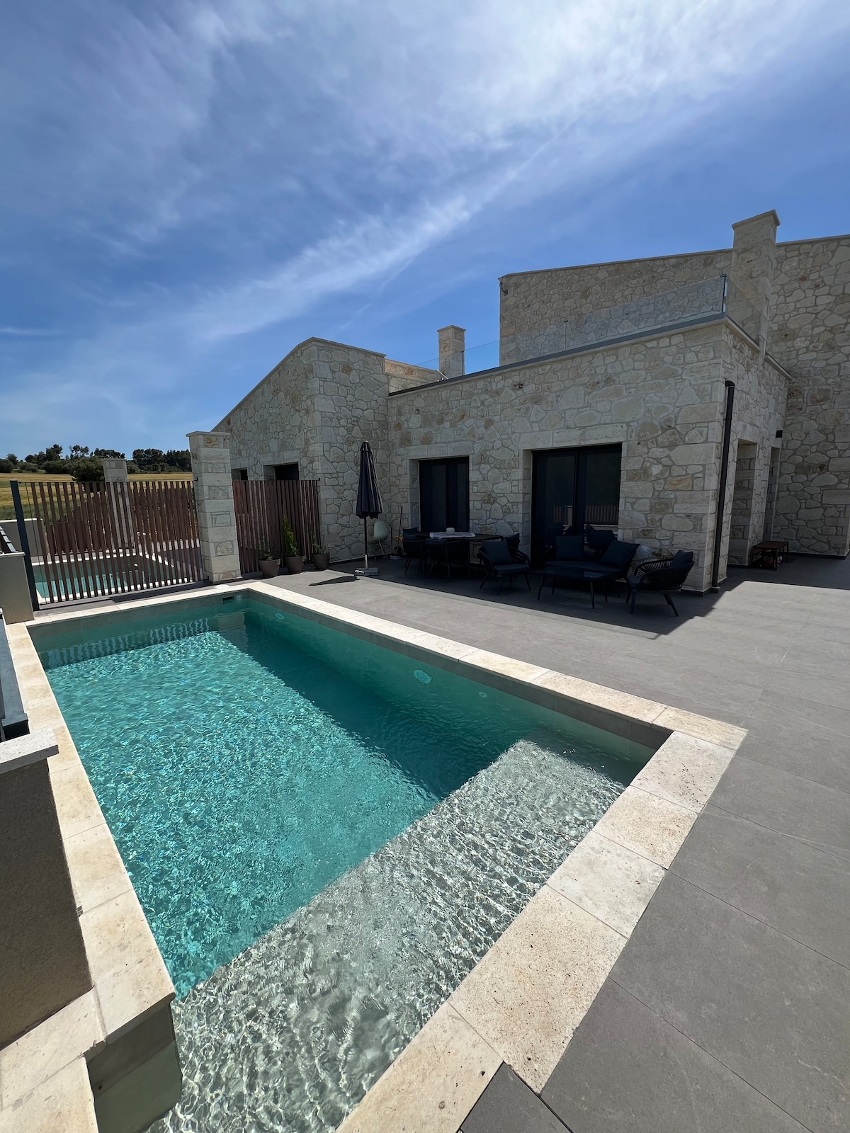 On a hill in the traditional village of Nea Fokaia in Kassandra, Chalkidiki, those modern stone houses are built in harmony with the landscape. The view from the swimming pool area is expanding towards the olive trees and sea and the access to the nearest beach is an only seven-minute walking distance. Those modern stone villas with private pool create a relaxed and restful environment. They are light and airy designed in alignment with indoor-outdoor living concept.