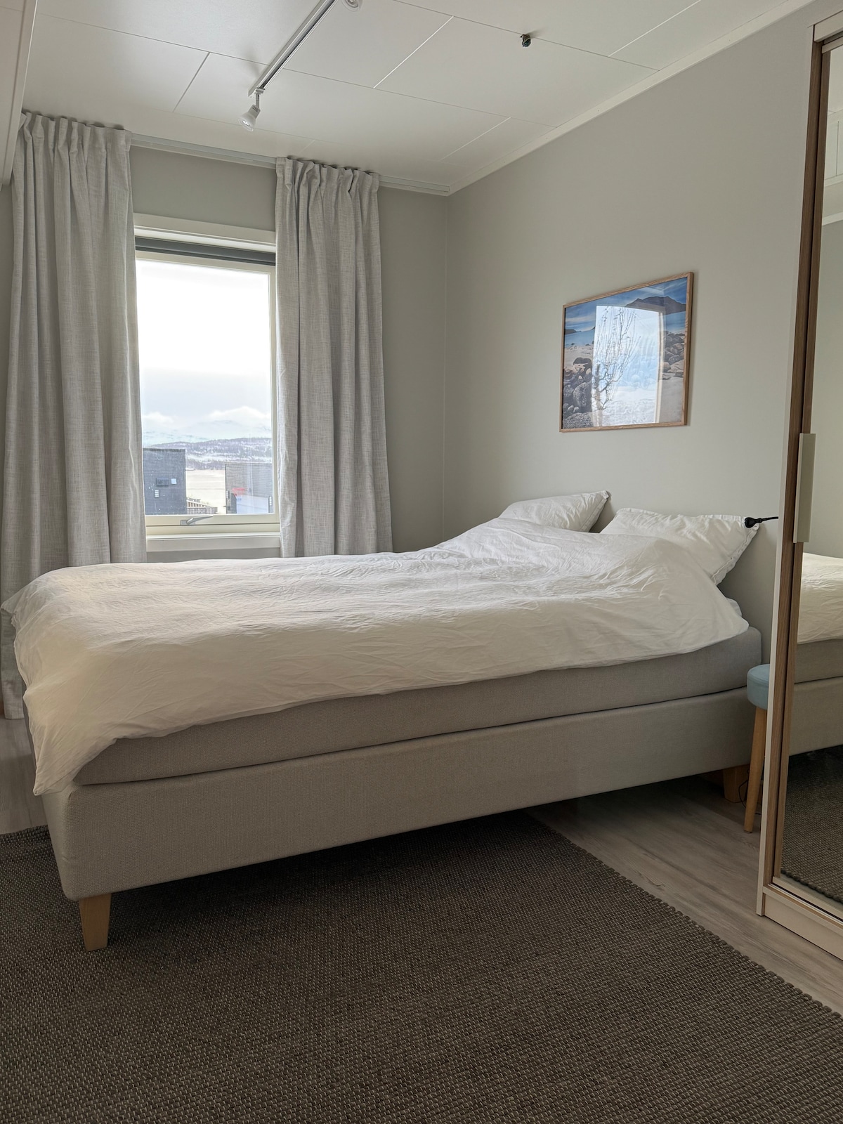 Stylish top-floor apartment by the sea in central Tromsø with an impressive view of the Arctic Cathedral, Tromsø Bridge, Cable car, midnight sun and the Northern Lights. Enjoy Hurtigruta sailing in from the sofacorner and hear waves lapping outside. The entrance is part of a glazed terrace with views to the south. The center is a 10-minute walk away. The apartment is open, inviting, and a nice & comfortable place to spend your time. Age limit to rent: minimum 25 years. NO SMOKING OF ANY KIND.