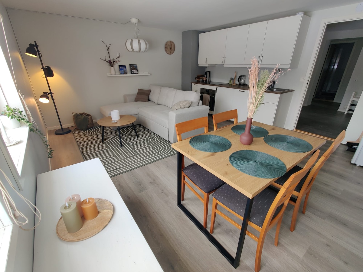 Cool and modern apt with high standard! Built in 2021. Near nature for mountain tours, skiing and paddling. Do kayaking, go on the roughest - or easiest - mountain peaks by randonee or foot. Tromsøs nightlife with fantastic restaurants minutes away. 2 double bedrooms. Located right by the sea. 12 min from the airport, 14 min from Northern Norway's largest shopping center and 20 min from the city. Great convenience store 4 min away. No street lights, no traffic, no asphalt. Welcome!