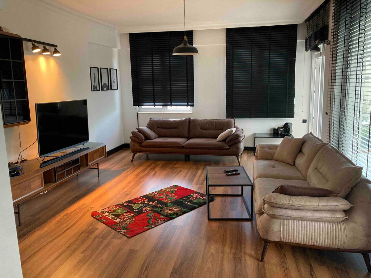 120 m2 modern, comfortable, luxurious apartment in the city center, equipped with all amenities. It offers views of the Old Town, the sea, and the Taurus Mountains. It's a 3-minute walk to the Old Town, a 10-minute walk to the marina, and a 10-minute walk to Mermerli Beach. Tram and bus stops are nearby. It's 100 meters from Hadrian's Gate, the entrance to the Old Town. It's 50 meters from the nostalgic tram stop. The metro station leading to the airport is 400 meters away.