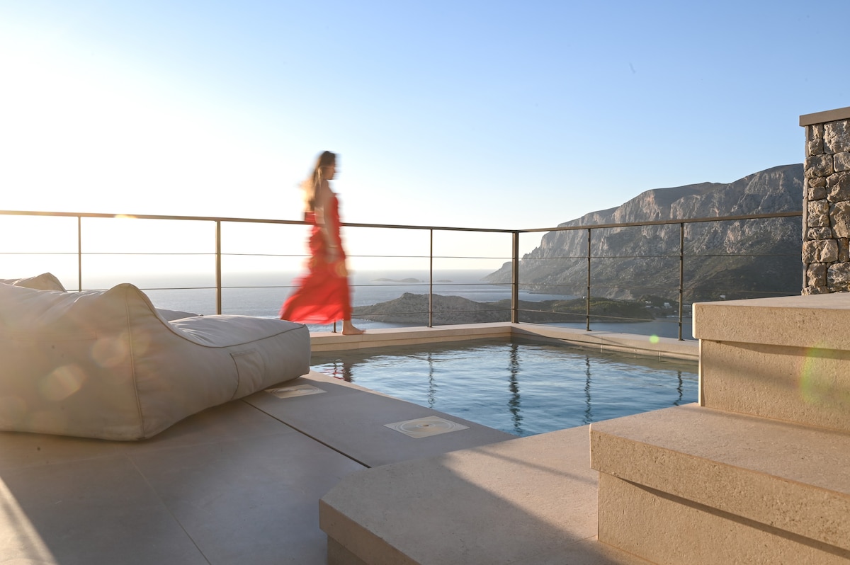 Escape to a stylish loft studio where comfort meets adventure. Sleep peacefully on the king-size loft bed, relax on the sofa bed, and enjoy a fully equipped kitchenette for all your needs. Step out to your private terrace with plunge pool and take in stunning views of the Aegean Sea and Telendos. Just minutes from top climbing spots and Masouri, with shops, cafes, and beaches nearby.