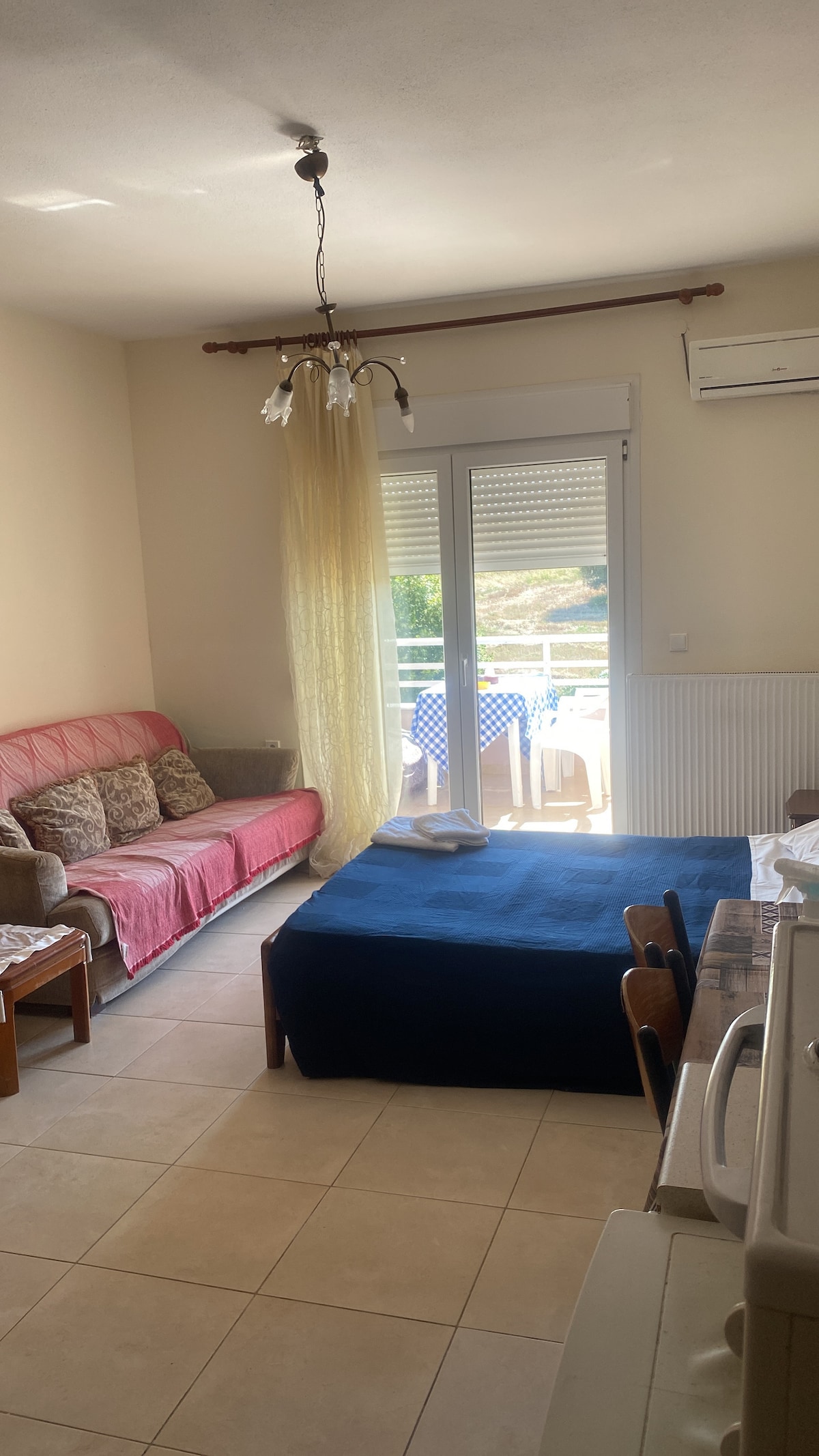 Our spacious, fully renovated apartment is tastefully furnished with modern amenities, including two air conditioning units, fiber-optic internet, a washer, a dishwasher, and a fully equipped kitchen for a comfortable stay. Designed with you in mind, it ensures you feel right at home. The bedroom is separated for added privacy. You'll be steps away from the beach, with easy access to tavernas, restaurants, cafés, stores, a bus stop, a tennis court, and a local museum. BEACH - 1-2 min walk.