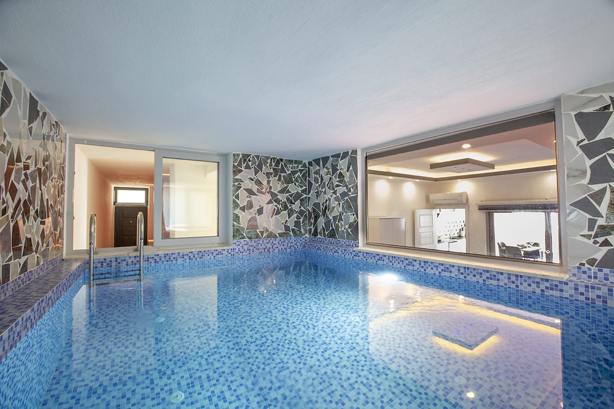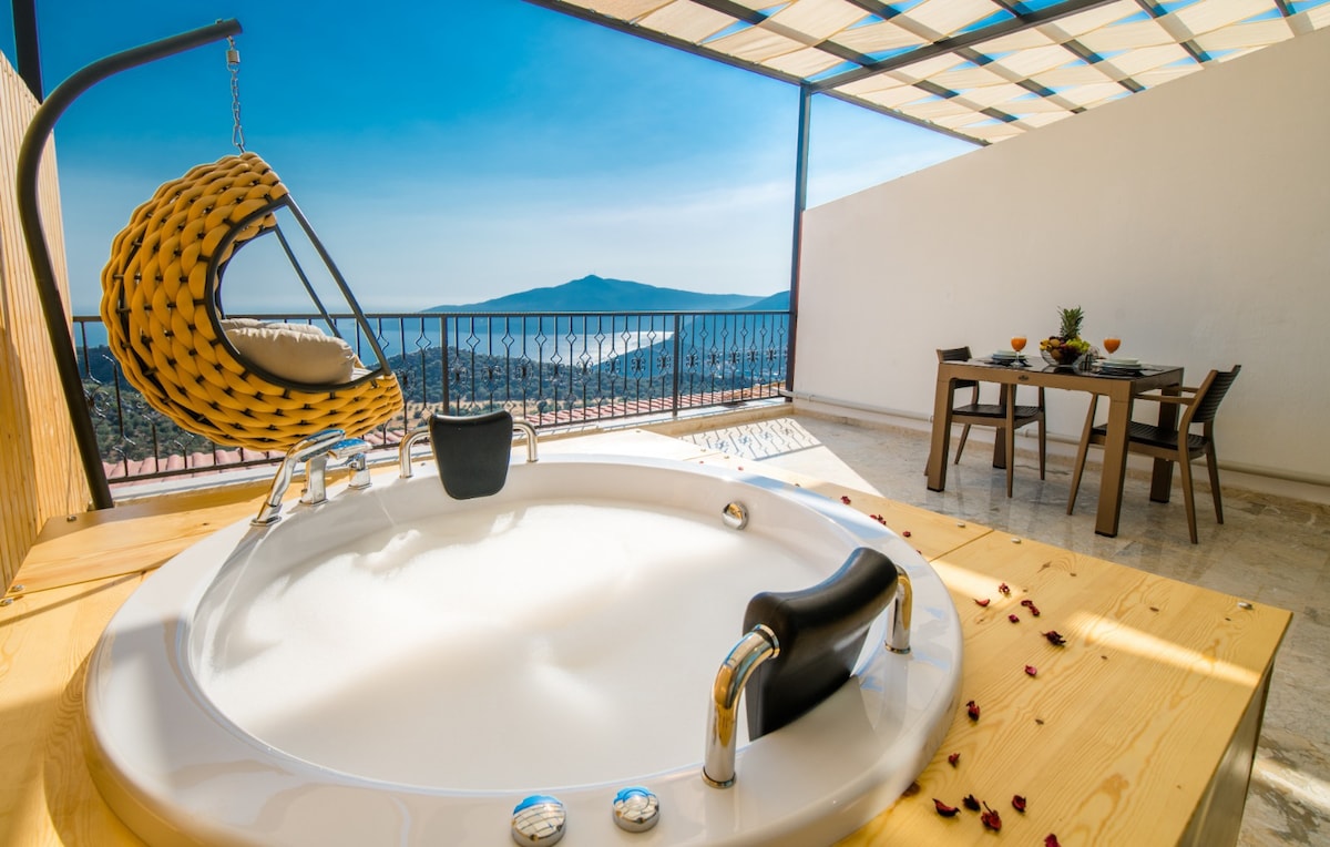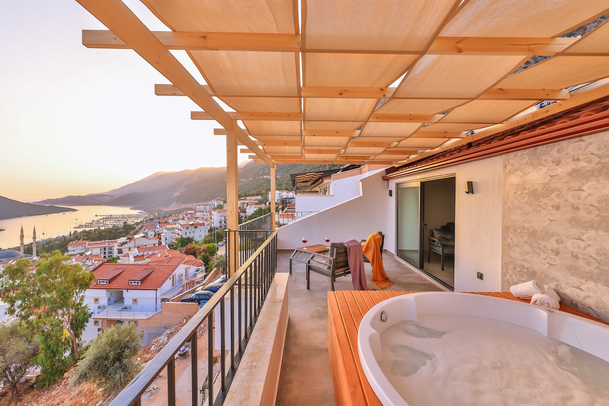 Nyrenoverad Svit i Kalkan med fantastisk havsutsikt, jacuzzi och pool! Den moderna skandinaviska stilen ger en ljus och luftig känsla. Lägenheten har ett komplett lyx kök och plats för upp till 6 personer . 5 min till stranden, 15 min till Kaputas Beach. Lugnt område med parkering och butik i närheten som levererar. Perfekt för par eller familjer som vill koppla av. Tidigare Kirlangic Aparts, nu med en ny touch och renovering.
