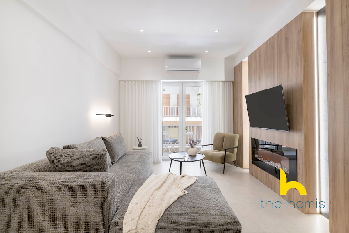 Set in an easygoing neighborhood, the apartment is steps away from a bakery, patisserie, supermarket, and seafood markets. Just around the corner is a popular Greek tavern called Ramona, as well as a traditional souvlaki spot in Dimosthenous 48 .