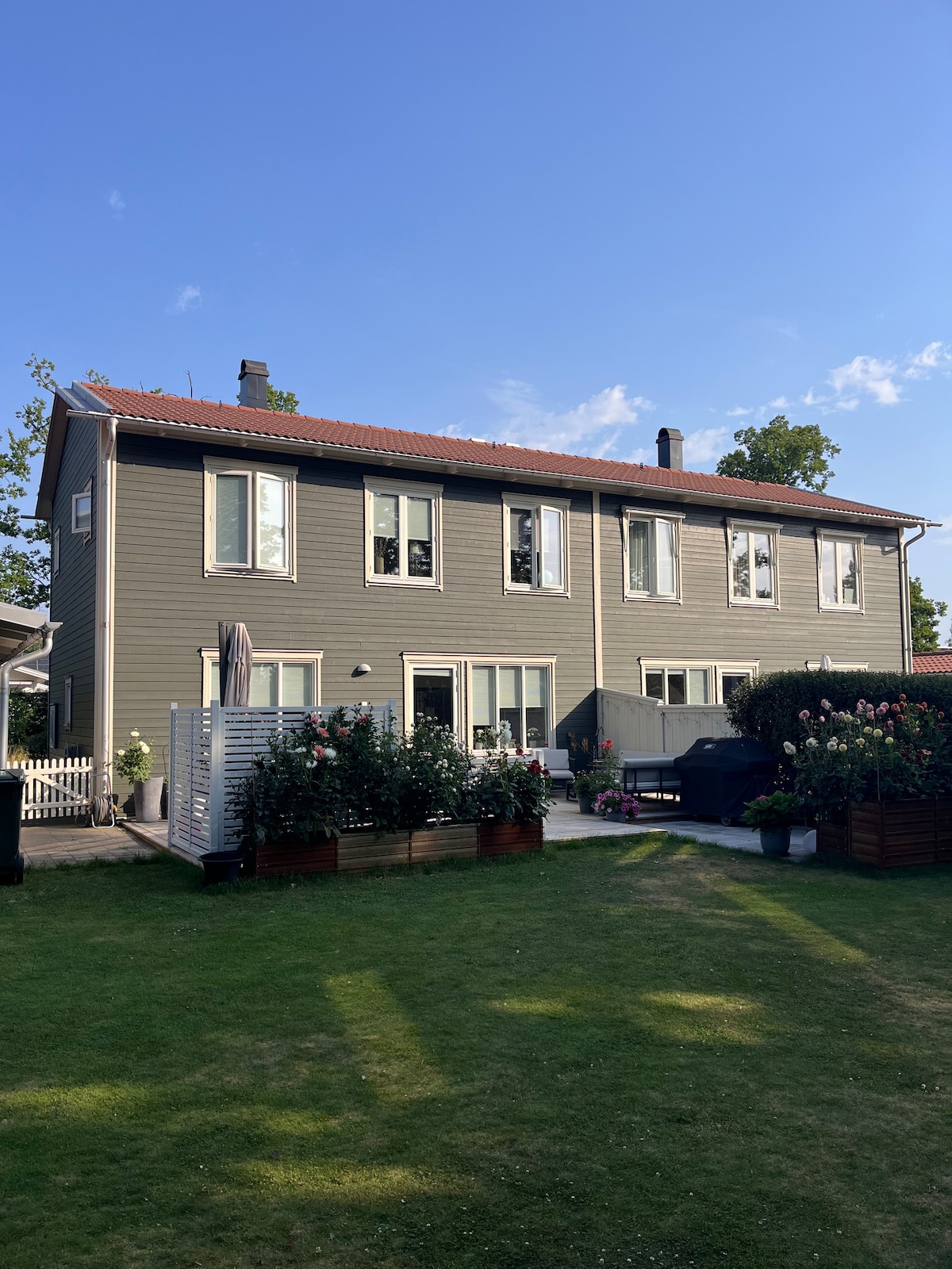 Townhouse on quiet street in Kalmar old town. Next doors to the botanical garden. Close to Kalmar castle, the beach, a bakery, supermarket, playgrounds, parks and a recreational area. The house has a private bakyard with several seating areas, a terrace, balcony with ocean view, and private parking for at least two cars. Bike rent included. The house is devided on three flors. Basement with washing machine. Kitchen and livningspace on the first and three bedrooms and a bathroom on the third.