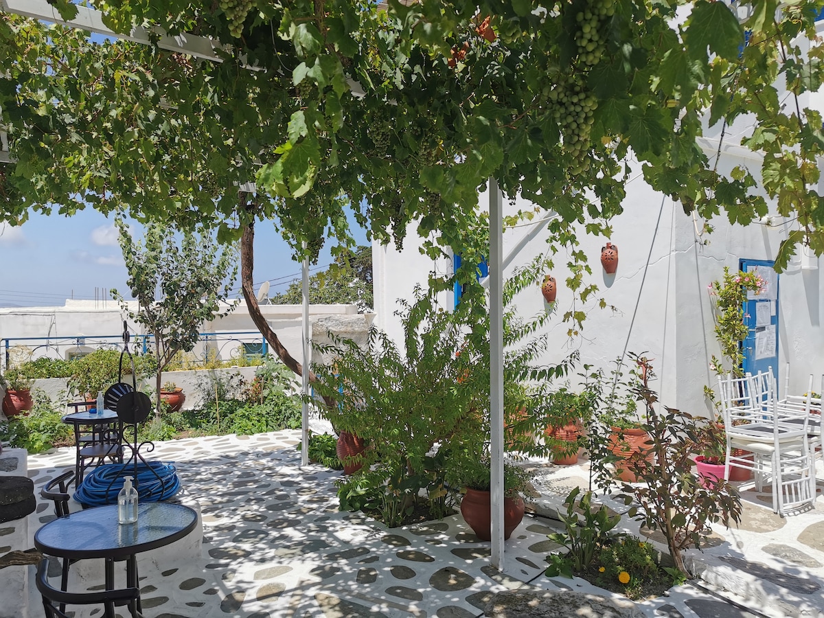 The ground floor apartment is situated in Chora of Amorgos island. It is built with stone from 1866, as proved by the inscription on the entrance stone, found in the old mill. It has a separate entrance, exit to our garden. This apartment can accommodate up to 2 guests, as features a double bed and a sofa next to the kitchenette. It also has a private bathroom with shower / WC. Free Wi-Fi available.