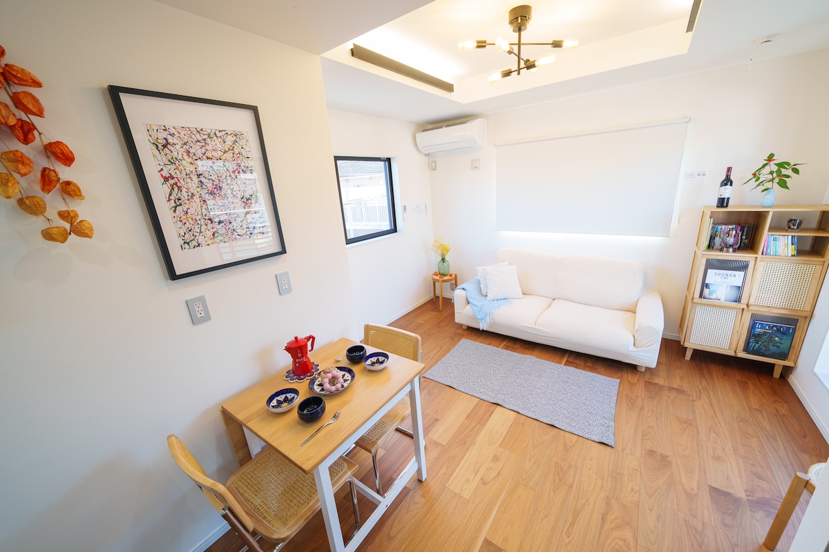 Adults up to 4. 2 double beds (+ up to 2 extra floor mattresses available for a fee) A stylish and cozy house in a quiet residential area, 2 minutes to beach. Designed with warmth and creativity, the space features wood textures, an open kitchen and dining area, and a calm atmosphere perfect for relaxing or working remotely. Relax on the rooftop with a dining table — perfect for coffee, meals, and Mt. Fuji views. Please respect neighbors; no parties or loud gatherings allowed.