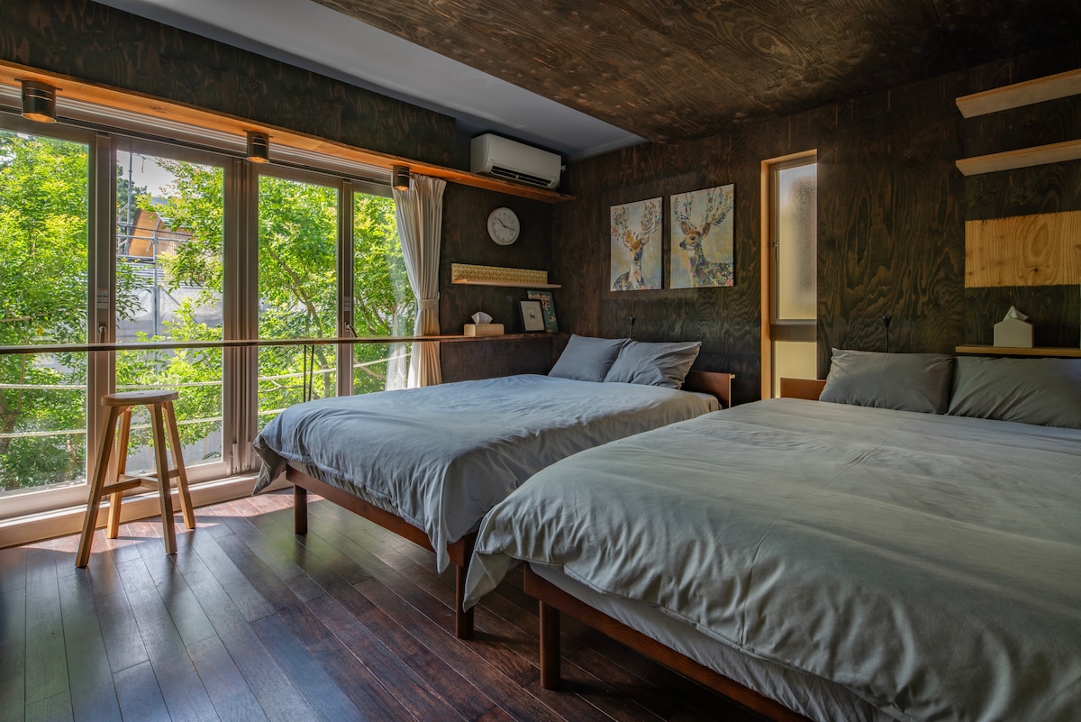 Adults up to 4. 2 double beds (+ up to 2 extra floor mattresses available for a fee) A stylish and cozy house in a quiet residential area, 2 minutes to beach. Designed with warmth and creativity, the space features wood textures, an open kitchen and dining area, and a calm atmosphere perfect for relaxing or working remotely. Relax on the rooftop with a dining table — perfect for coffee, meals, and Mt. Fuji views. Please respect neighbors; no parties or loud gatherings allowed.