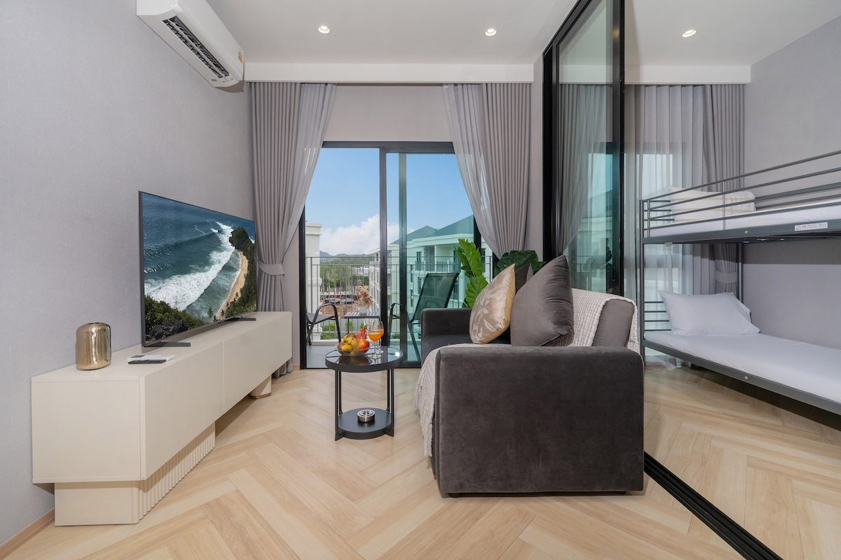 Stay at Title Legendary Bang Tao and enjoy a modern 1-bedroom apartment with calming city views, bright interiors, and a full kitchen. Relax on your private balcony or unwind at the project’s resort-style pools, sauna, gym, and lush garden areas. The building offers 24/7 security, elevators, and easy access to cafés, shops, and Bang Tao Beach, just a short walk or drive away. Perfect for couples, long stays, and remote work, with fast Wi-Fi and in-room amenities designed for comfort.