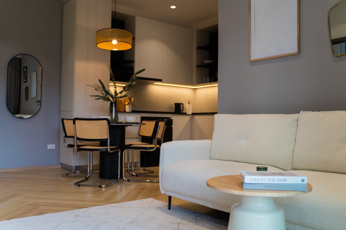 Please be noted, there are construction work near condo. The Title Legendary, in the heart of prestigious Bang Tao, just 700 meters from the beach. A bright apartment of 44 sq. m, in a laconic modern design, equipped with high-quality designer furniture and advanced technologies, each of your days will be filled with coziness and comfort. A family of 4 or 4 adults will comfortably stay here. Panoramic windows with a beautiful view of the garden and pools.