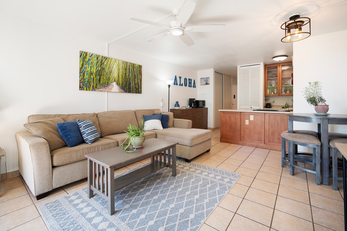A welcoming 2nd floor, one bedroom 723 sq ft condo at Kihei Kai Nani complex across from beautiful Kamaole II beach, in Kihei. It is updated, fully furnished and equipped with full kitchen, King size bed (new mattress in 2025) and a fold out queen sofa-bed (sleeping 4). Book with confidence: The Kihei Kai Nani resort has been zoned as a Hotel / Business Resort since it was built in the 70's. It therefore is not impacted by current legislation regarding Short Term Rentals on Maui.