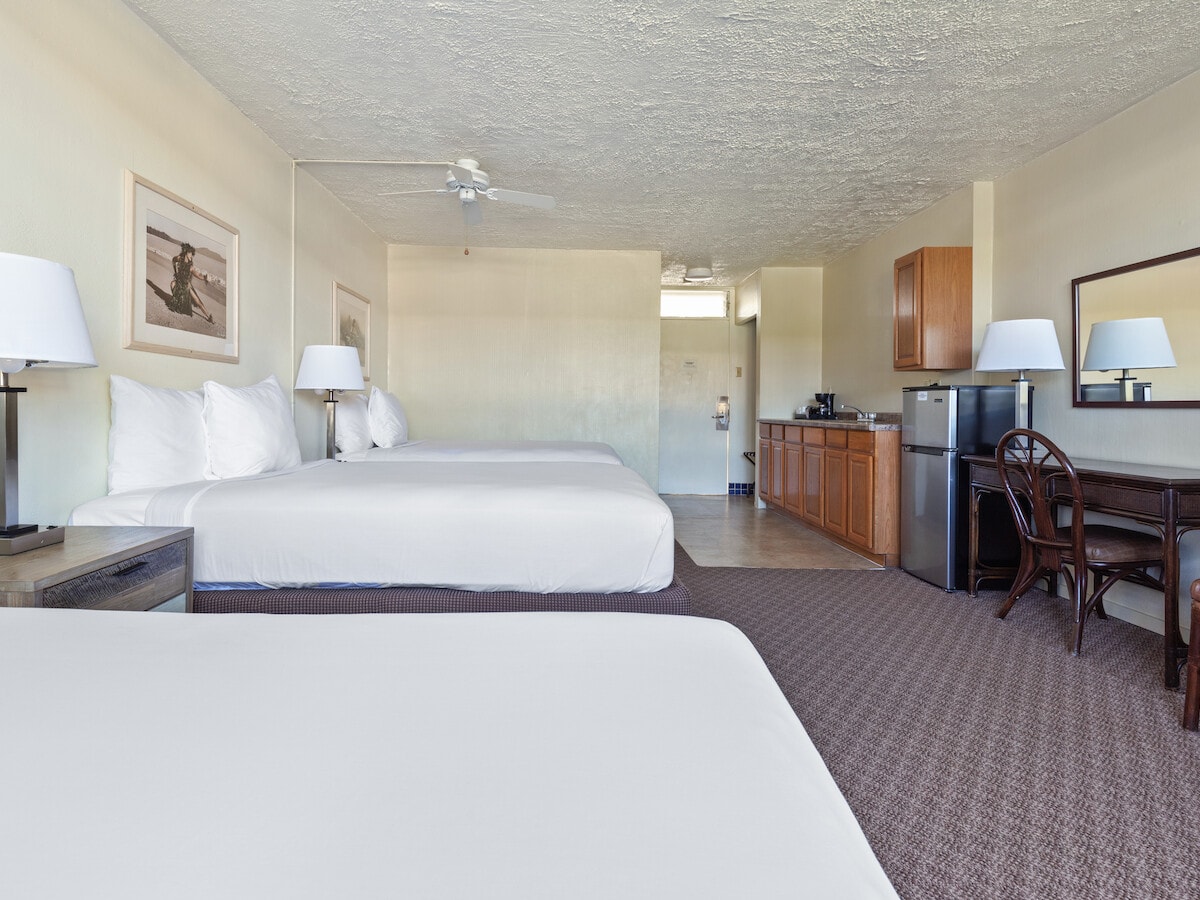Enjoy a relaxing stay in a courtyard double queen room, featuring two queen beds and a private lanai with lush views of the Meditation Lawn. The space includes air conditioning, a mini-refrigerator, safe, bathtub, and telephone for your comfort. High speed internet access and breakfast are included to enhance your experience. Thoughtfully designed, this room is perfect for a peaceful and rejuvenating visit.