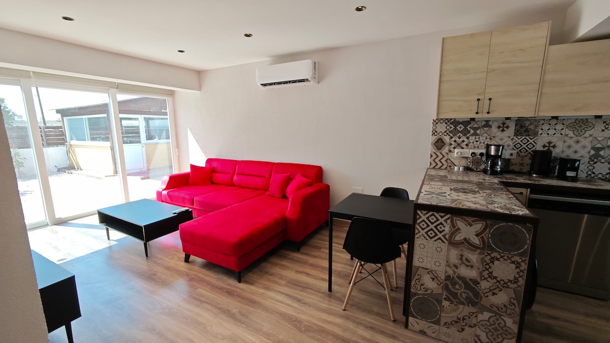 The flat is located in a quiet and well maintained building, in a no through beautiful road, 5-10min walk from Finikoudes promenade and beach. Large living room with a sofa bed, kitchen, a bedroom, bathroom renovated in Nov 24, balcony with distant sea view. The center and the main bus terminal is a 5 min walk, so if you don't rent a car, you will still be in the middle of everything. 200/30 Mbps internet. Zorbas bakery & ready meals is across the street. To see more flats, go to our profile