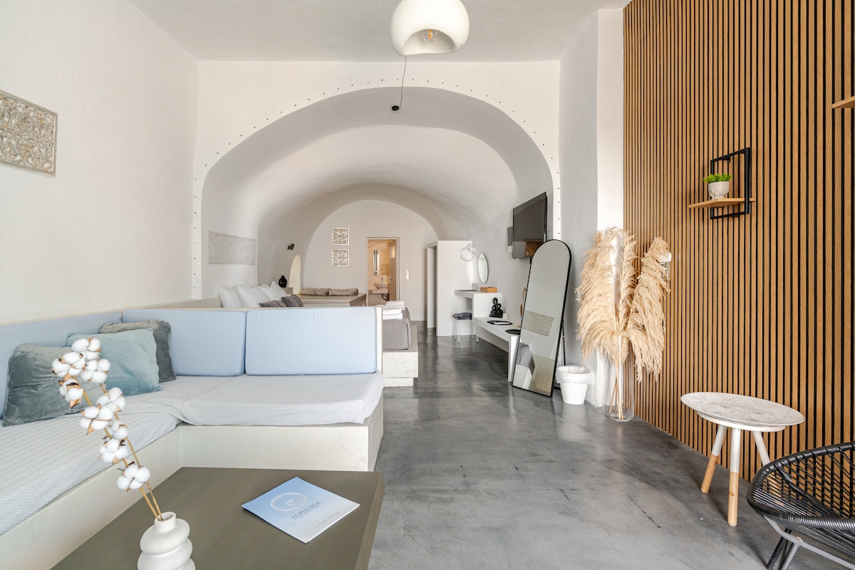 Our Illusion Suite (45 m²) is a traditional cave suite, located in Fira, the heart of Santorini. Just 7 minutes walking distance from the centre and from the unique view of Caldera. It is fully equipped with a private bathroom, king size bed, free high speed Internet, wifi, fully equipped kitchenette, safe box, wardrobe, 50 inch smart TV, Usb wall chargers, courtyard, breathtaking seaview and it is fully climatised. Free cleaning daily. Tip: Don't miss the unique Sunrise.