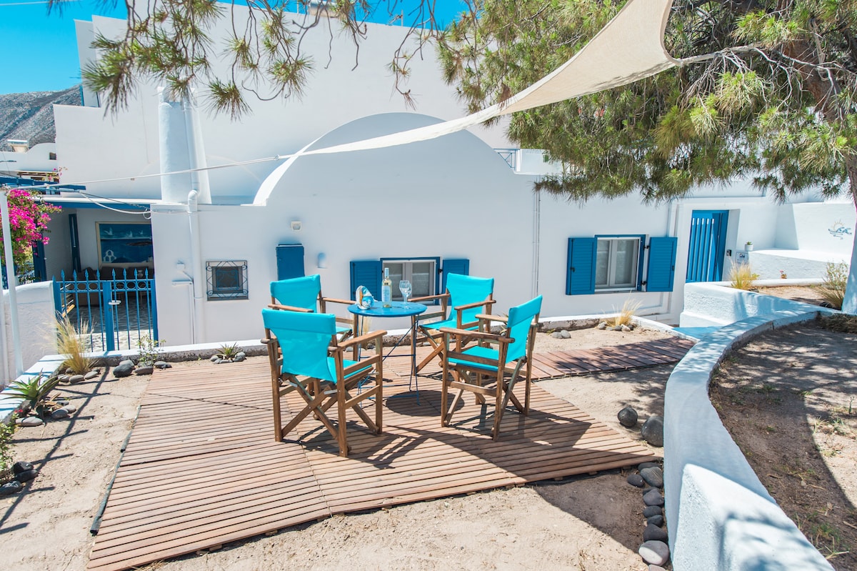 The house is situated in the best part of Kamari beach . A semi-private road leads you there . You can have a sunbath in the private terrace while enjoying the view of the sea. Allthough secluded , the village ,the beach, a bakery and a mini market are accessible within a 3min walk .We provide daily cleaning service and beach towels, change bath towels every day and sheets every two days.In the kitchen there is an espresso machine, espresso caps.