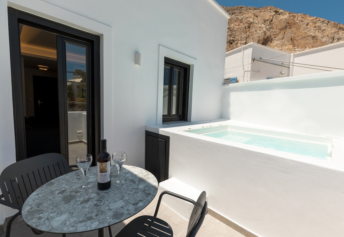 Anemos suite is located in Akrotiri overlooking the caldera and the volcanic islands . It is a suite with Private, Infinity heated Cave style plunge pool with Jet system and private patio. There is a king size bed that can accommodate two person. Daily breakfast is included and served in your suite . There is a cleaning service included. Inform us about your arrival details in advance , we can arrange a taxi/transfer for you.