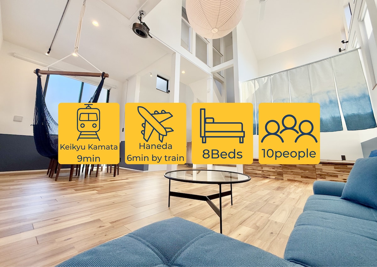 横浜、東京の人気観光地へのアクセス抜群の蒲田エリアにある、新築4階建ての一軒家。家族やグループ旅行にぴったりな広々とした空間で、快適な滞在をお楽しみください。 ✨おすすめポイント 1. 広々としたプライベート空間 4階建て、家族全員がゆったり過ごせるスペース。快適なベッドと清潔なリビングでリラックスできます。 2. 便利なアクセスで観光もスムーズ 最寄りの蒲田駅まで徒歩8分。品川や横浜まで電車で約10分、東京や渋谷など主要エリアへも直通でアクセス可能です。羽田空港までも電車で10分。 3. 家族みんなが楽しめる周辺施設 徒歩圏内には和食やイタリアン、居酒屋などのレストランが充実。50メートル以内にコンビニや人気のクレープ屋もあり、買い物や軽食に便利です。JR蒲田駅にはユニクロや無印良品などショッピングスポットが充実しています。 ✨最寄り駅から主要エリアへの電車でのアクセス目安 品川・横浜:約10分(直通) 銀座・東京:約20分(直通) 渋谷・新宿:約25分 秋葉原・浅草寺:約30分(直通) 羽田空港:約10分(直通) ※宿泊施設から最寄り駅まで、徒歩で約8分かかります。